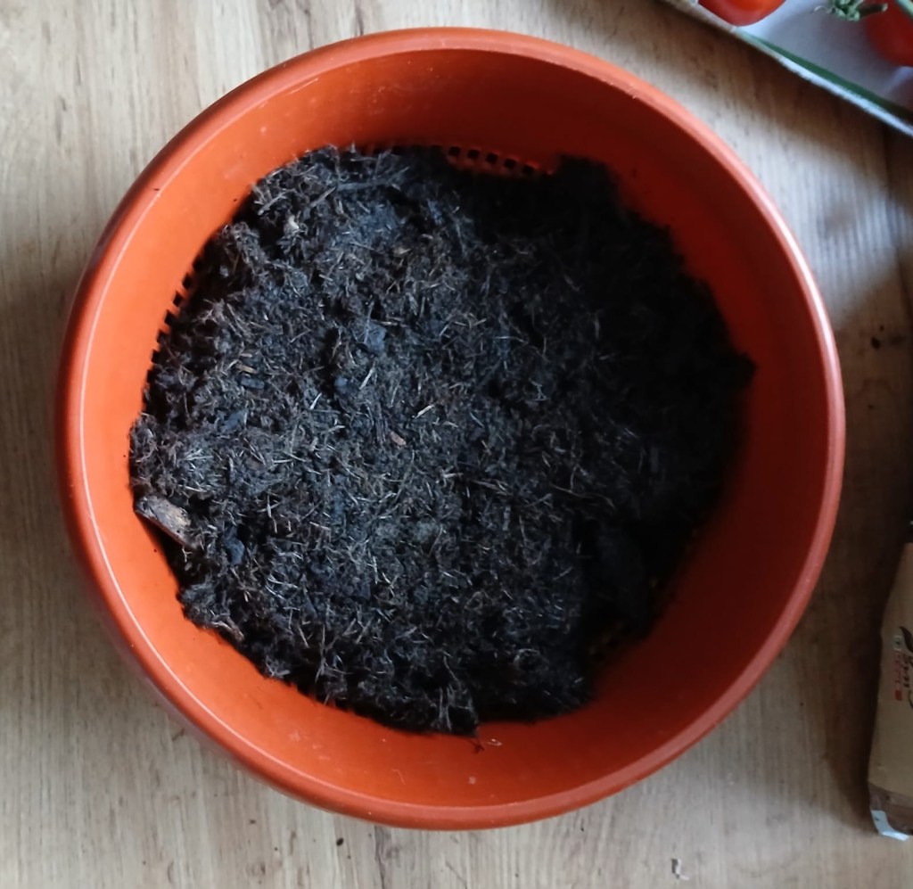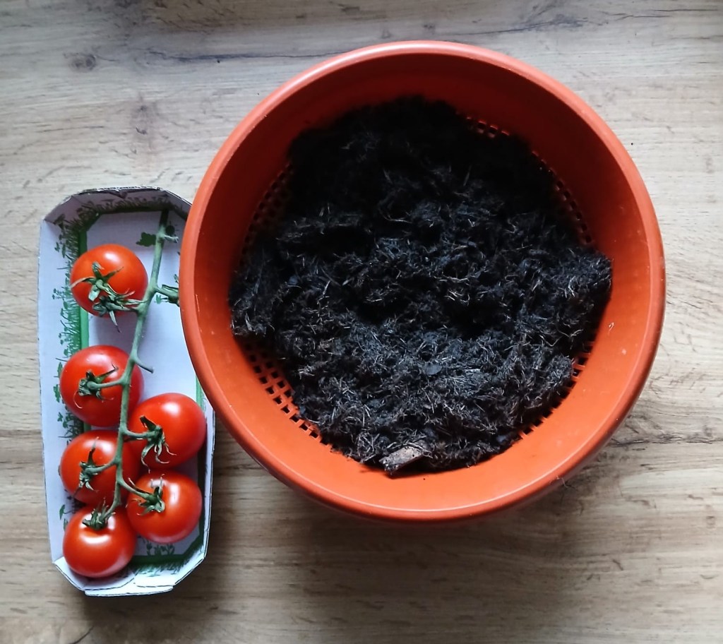 Nimm die Tomaten die du magst, schneide sie in dünne Scheiben und leg sie auf Erde (ich hab hier Erde aus dem Supermarkt genommen), und bedeck die Scheiben mit Erde.